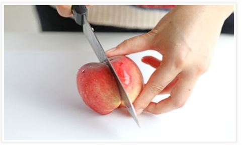 ①先於桃中心位置落刀並繞一圈切